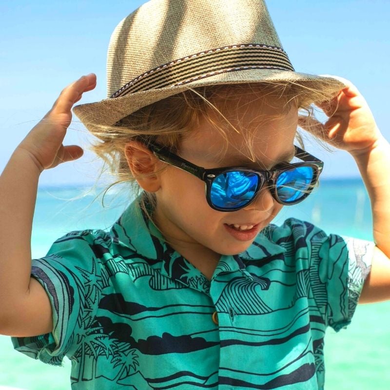 Unisex polarized baby sunglasses in a classic and beloved style. With a flexible frame and funky lens blue color. These are a smaller fit (please see sizing).